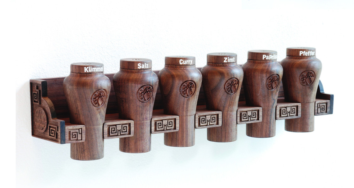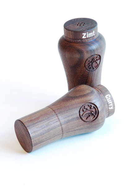 Das Gewürzboard und die Gewürzstreuer sind aus Nussbaumholz gefertigt.